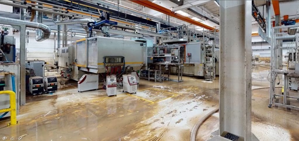 Screenshot: Digital twin using the BELFOR 360° Damage Scan, a high-resolution scan for damage documentation. In the image on the right, the steel beam still clearly shows how high the water level was.