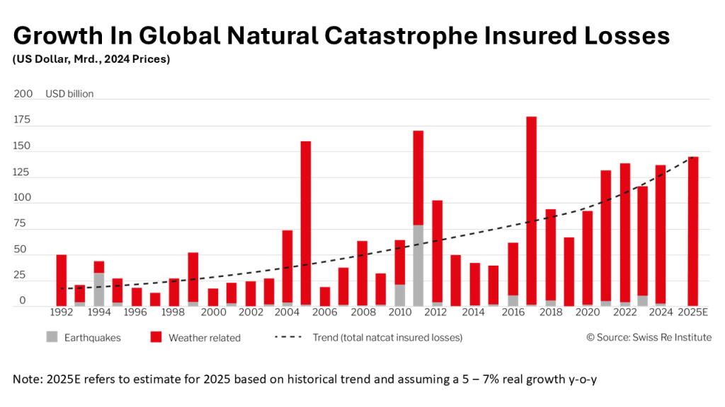 Following a steady trend of annual growth of 5 to 7 percent, a further increase to around 145 billion US dollars is expected in 2025. Even more concerning is the long-term forecast: with a probability of 1 in 10, insured damages could exceed 300 billion US dollars this year. At the same time, the gap between insured and uninsured damages continues to widen.